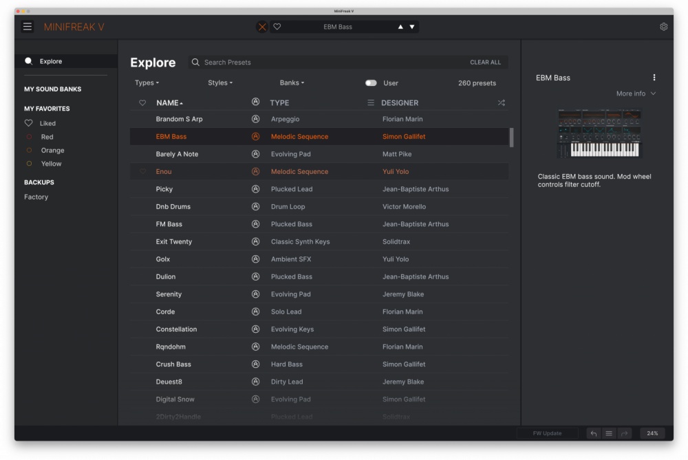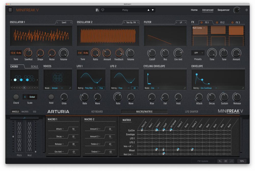 MiniFreak V is an experimental virtual instrument fusing digital voices with modeled analog filters, spontaneous modulation, and playing sequencing, unleashing endless sweet spots between familiar and unheard, order and chaos, beauty and beast. Set your wildest sonic creations free.