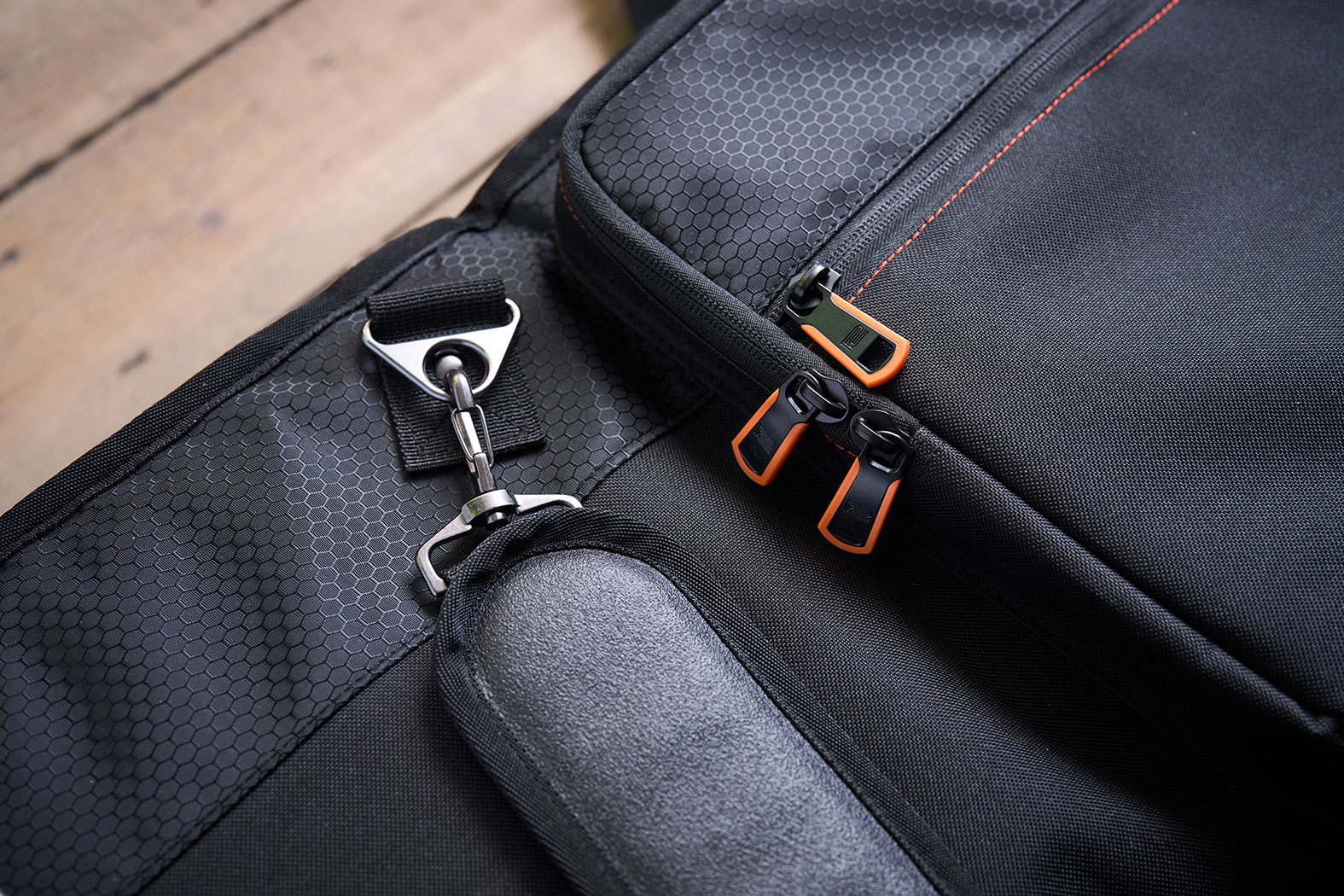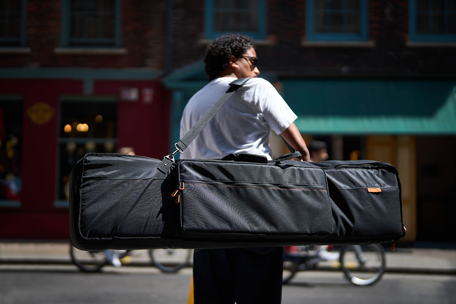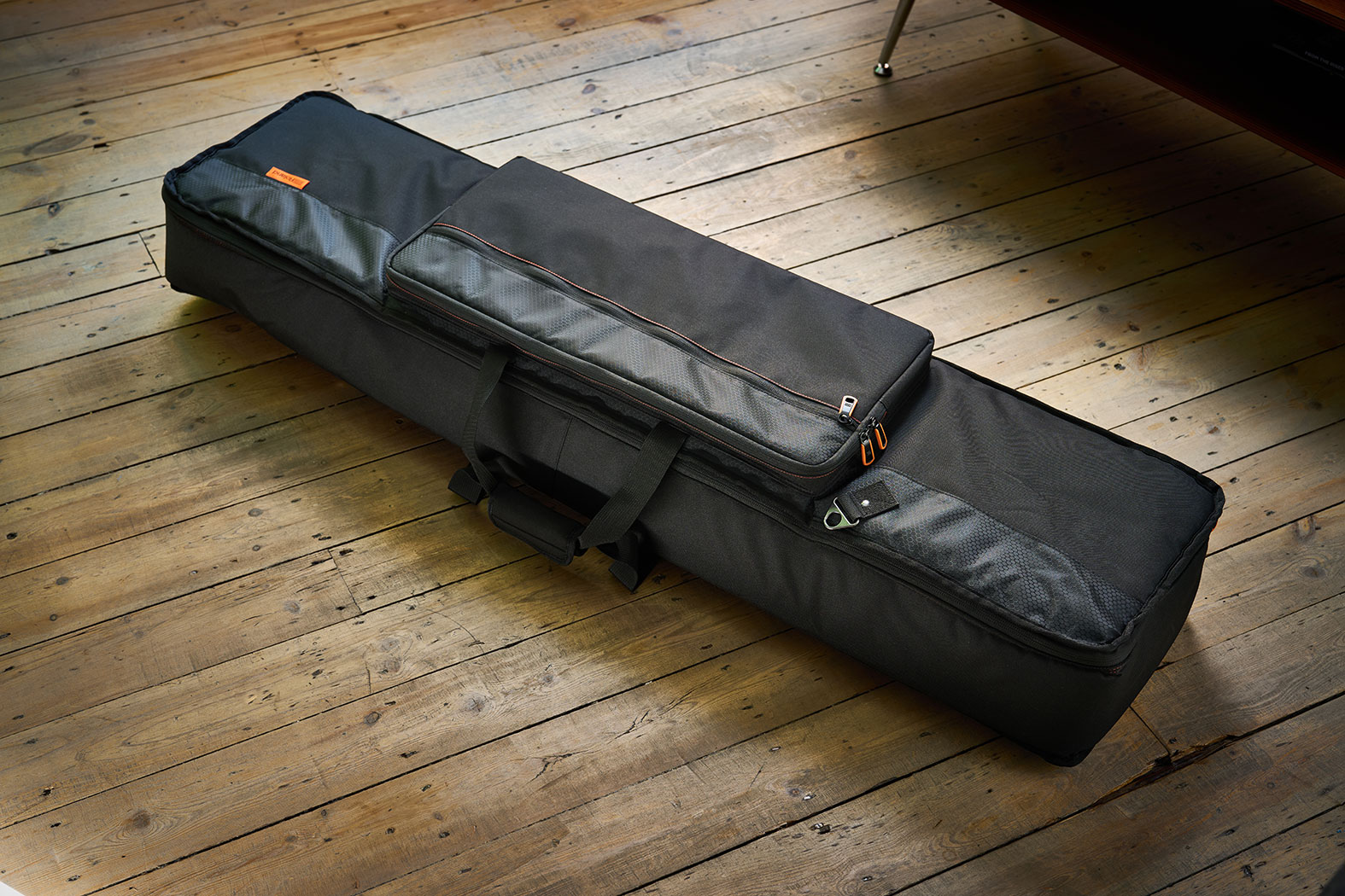 En stor lomme gir plass til pedaler, kabler, strømforsyning og annet tilbehør. I tillegg finnes en slank lomme som passer til smarttelefon,